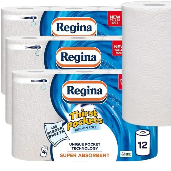 Today's Groupon offers 12 Regina Thirst Pocket Two-Ply Kitchen Rolls, distributed by Sun Exotic Wholesale LTD.
