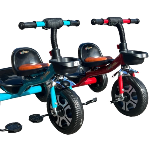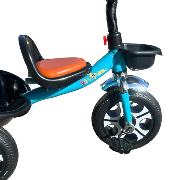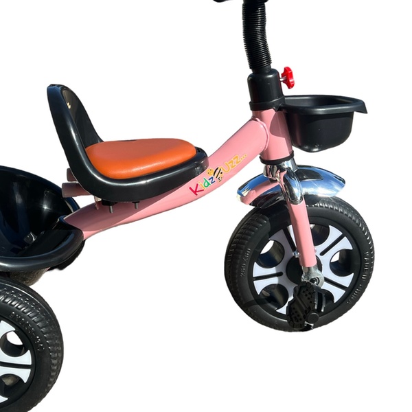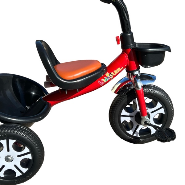 The Kidzbuzz Ride-On Pedal Tricycle is a sturdy and fun 3-wheeler for kids aged 2–5, featuring a steel frame, rubber grips, easy-to-use pedals, and a front basket—ideal for outdoor play and developing motor skills