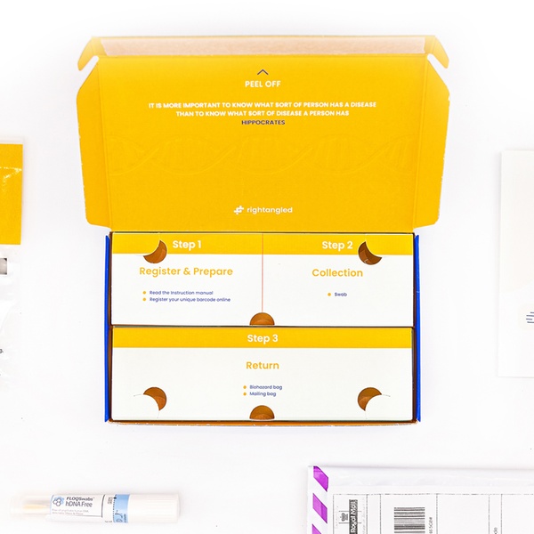 Rightangled offers commercial DNA testing for everyone. The samples and results are sent by mail, with conclusions and guidelines provided for every test. Customers can use the testing to optimise their diet, exercise routine or learn how to better care for their heart.