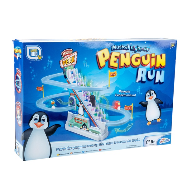 - Penguins race up the musical moving stairs and slide down the track to start all over again