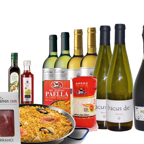 Experience the taste of Spain with this white collection of white wines, paella and Spanish charcuterie