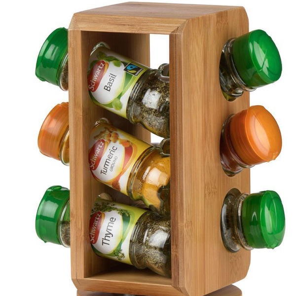 Keep herbs and spices at hand without cluttering up cupboards with these rotating racks featuring Schwartz spice bottles