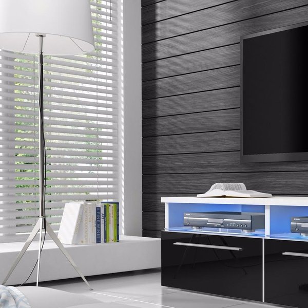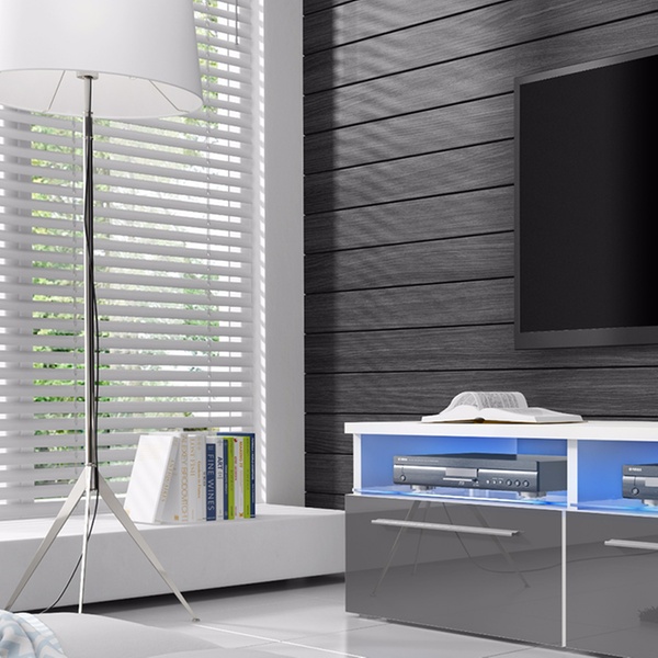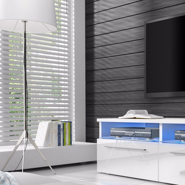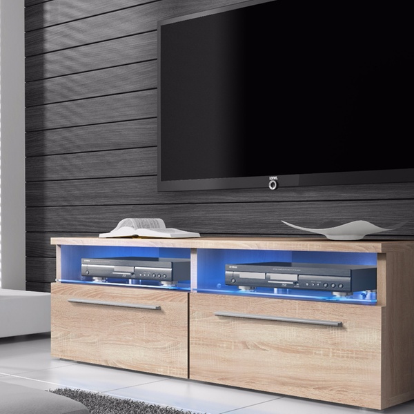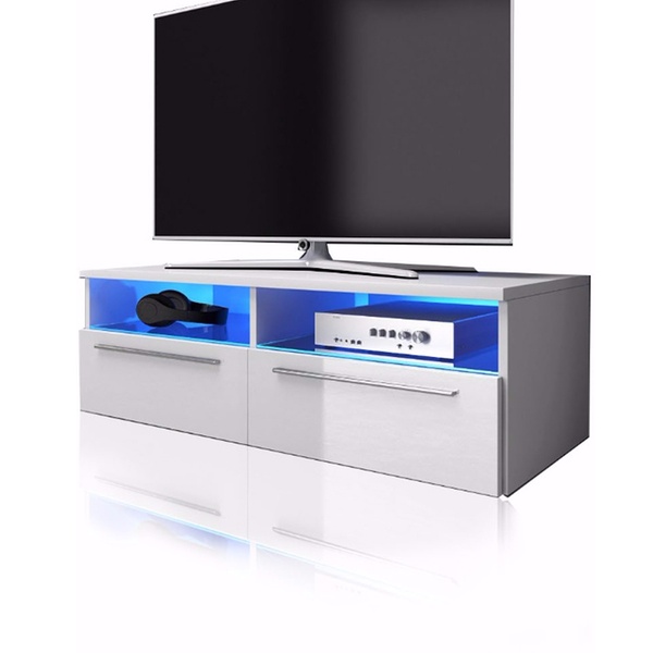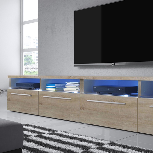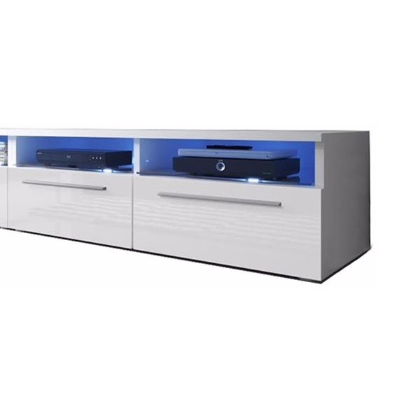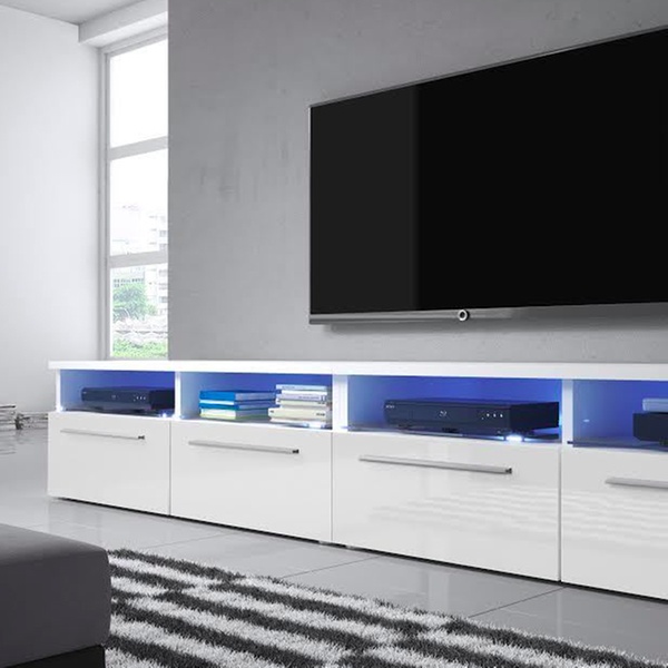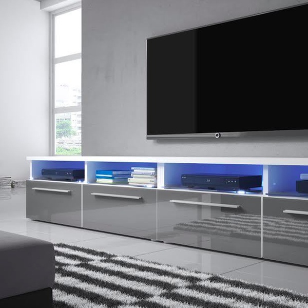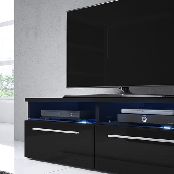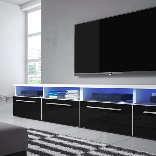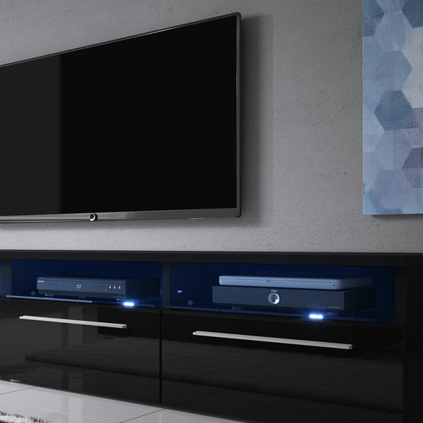 These cabinets are finished with plates of LED lighting and feature storage space for CDs, DVDs, remote controls and magazines