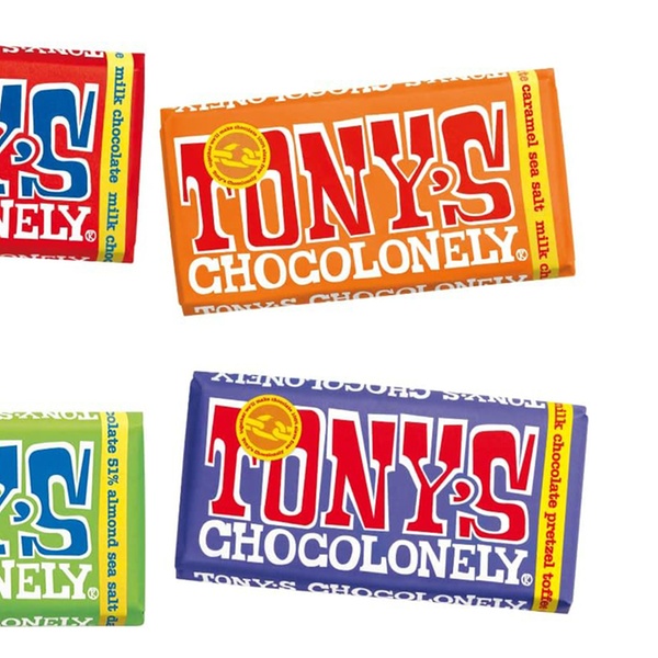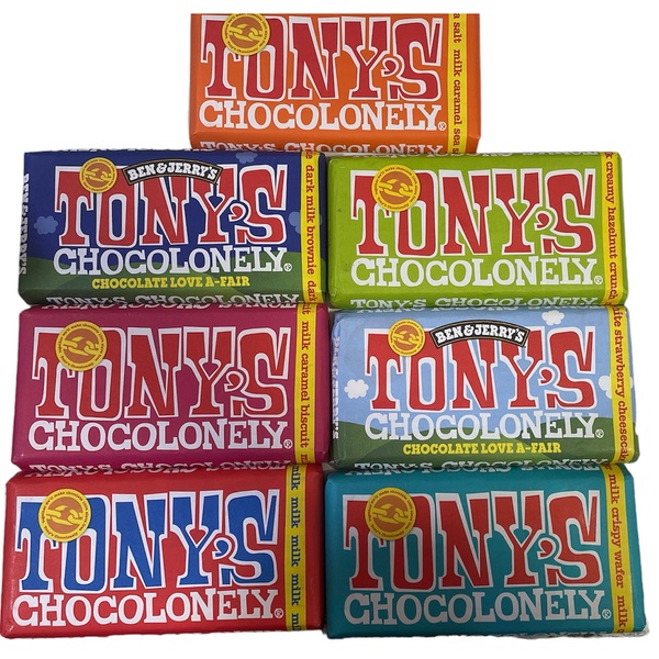 Tony's Chocolonely hamper includes 7 full-size 180g chocolate bars in a randomly selected mix of trendy and delicious flavours