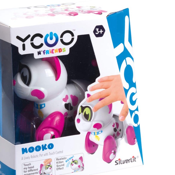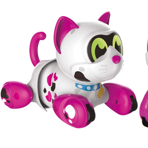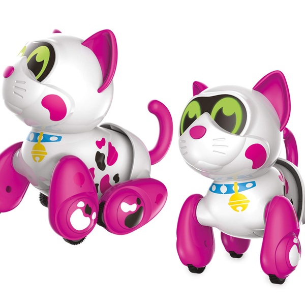 Battery-operated robotic toy kitten that moves, makes fun sounds and makes funny poses upon a touch control
