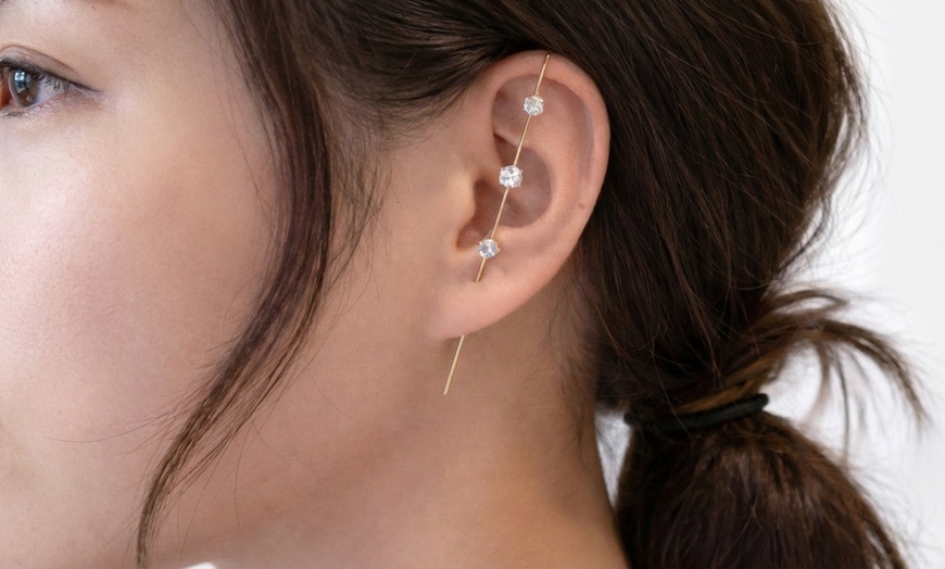 - The earring threads through the piercing and also hooks behind the top of the ear like an ear climber.