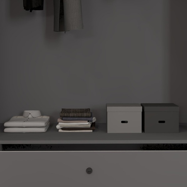 - Four spacious shelves for clothes or storage boxes