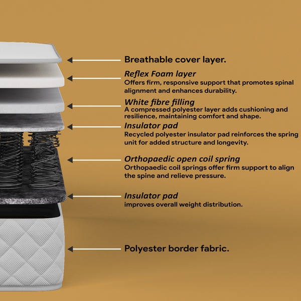 The Soothe Ortho Mattress combines firmer orthopaedic support with soft, cloud-like comfort, featuring a Bonnell spring system for healthy spinal alignment, breathable recycled layers, and a medium to firm feel suitable for back, side, and combination sleepers