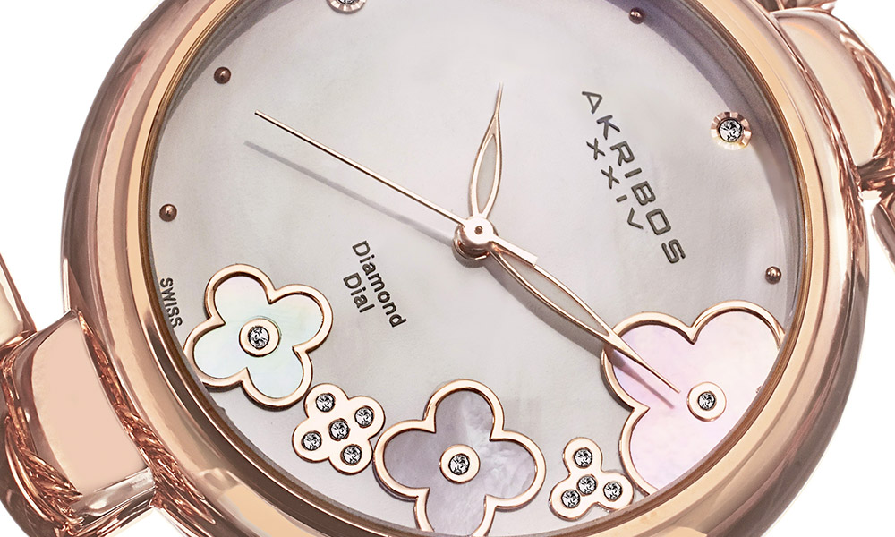 These watches make a statement on wrists with a mother of pearl dial, embellished with diamonds and a flower design