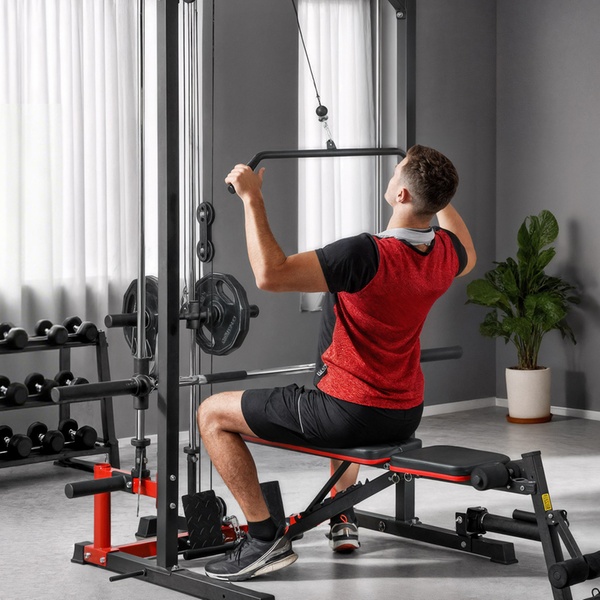 - All-in-one workout machine: pull-up stand, barbell rack, landmine, lat pull-down and low-row bars