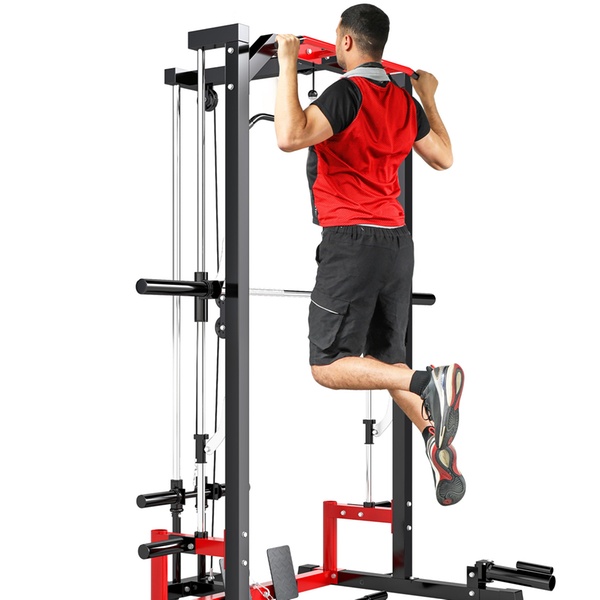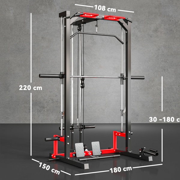 Designed for versatility, this all-in-one machine combines pull-up stands, a barbell rack, and multiple workout options for a complete gym experience