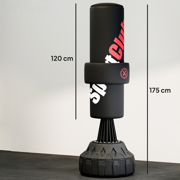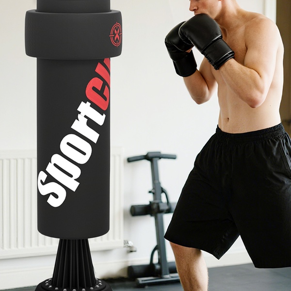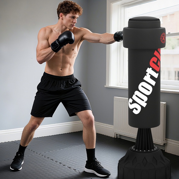 Freestanding punching bag with adjustable height, stable fillable base, and impact-absorbing spring system for effective full-body boxing training and fitness at home