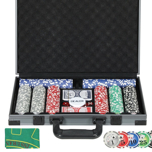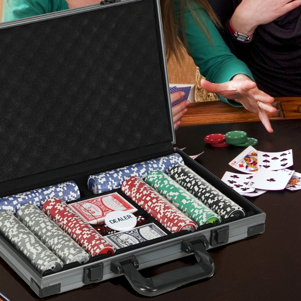 - Complete poker set featuring 400 chips, two decks of cards, five dice, a dealer button and a playing mat.