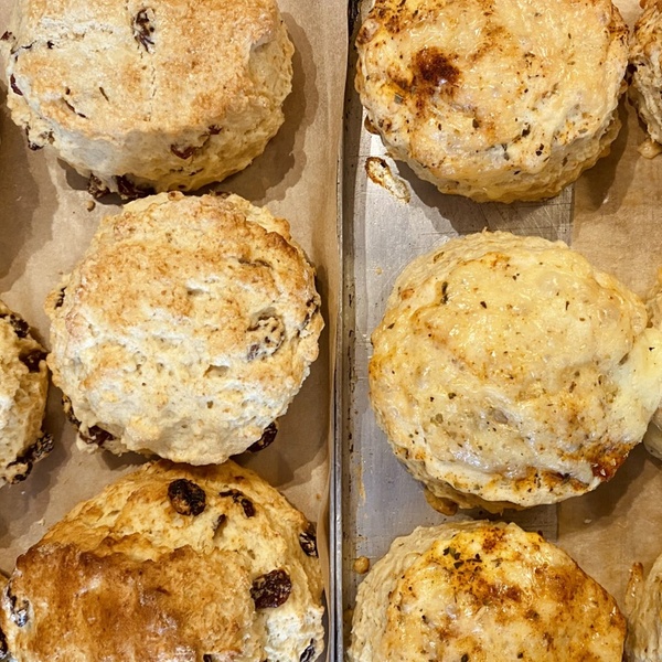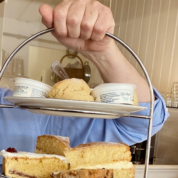 - Miniature homemade scones. Either plain with clotted cream or jam or cheese and chutney with a chive butter.