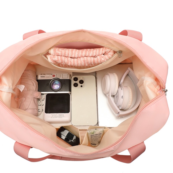 - Includes a separate wet/dry compartment, small pockets, and a back pocket for quick access