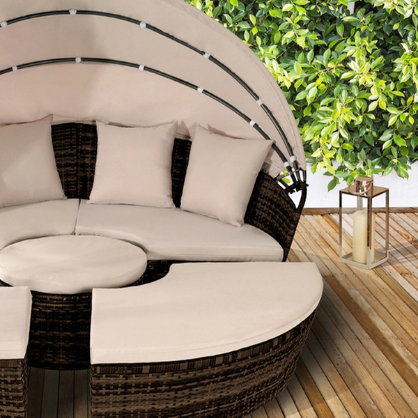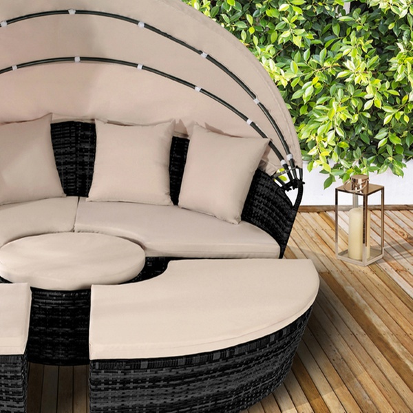 Featuring a retractable sunroof and backrest cushions, this easy-to-clean daybed can be an ideal addition to a garden or the pool deck
