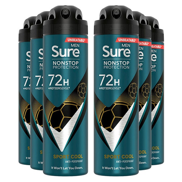 • Sure Men Nonstop Protection 72H Anti-Perspirant Deodorant Sport Cool 150ml, 6pk