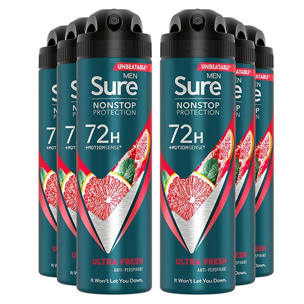 • Sure Men Nonstop Protection 72H Anti-Perspirant Deodorant Ultra Fresh 150ml, 6pk