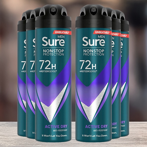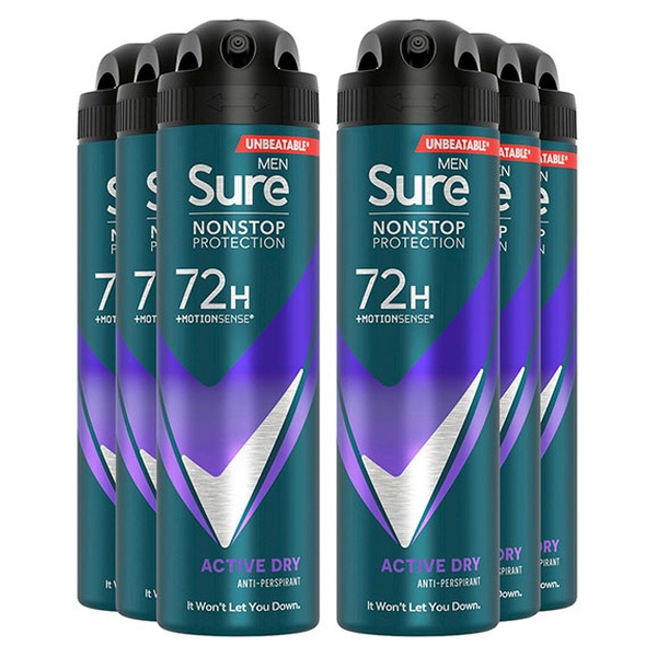 • Sure Men Nonstop Protection 72H Anti-Perspirant Deodorant Active Dry 150ml, 6pk