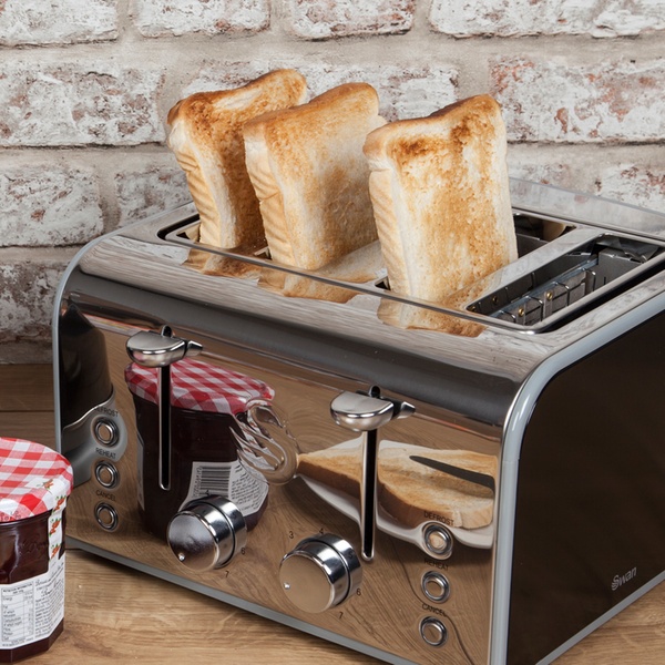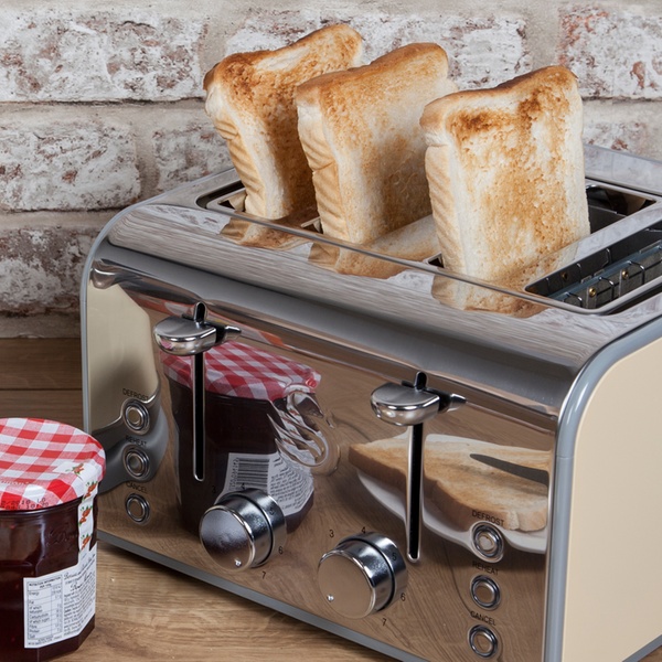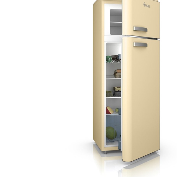 Add retro chic to the kitchen with this set of top-mounted fridge freezer, jug kettle and four-slice toaster available in three colours