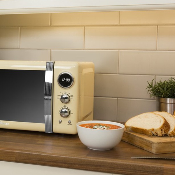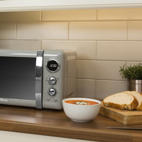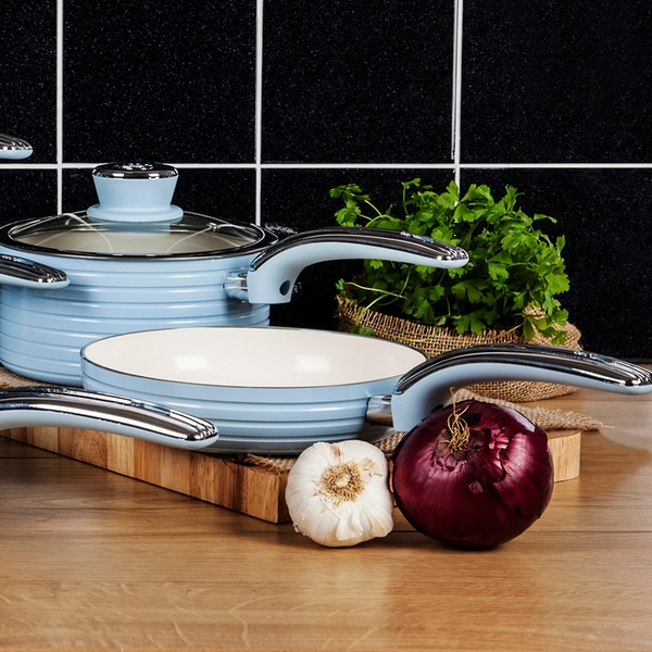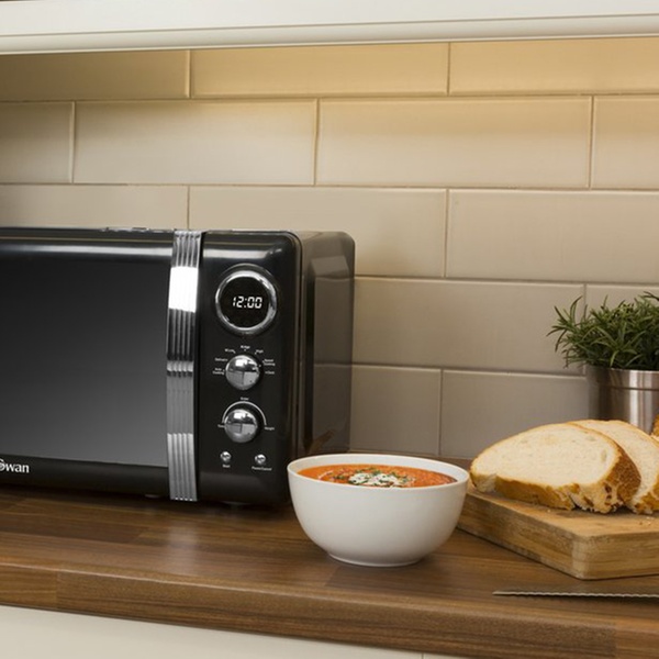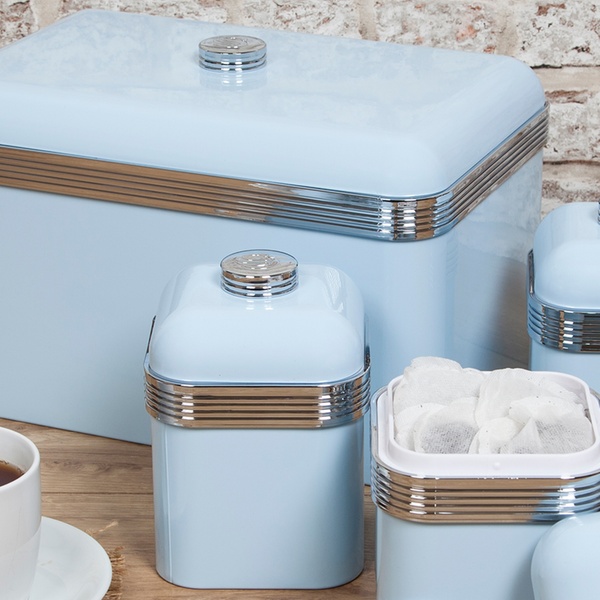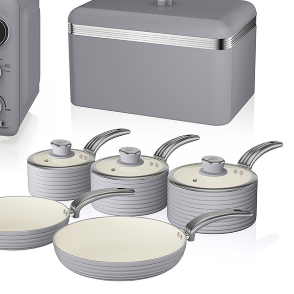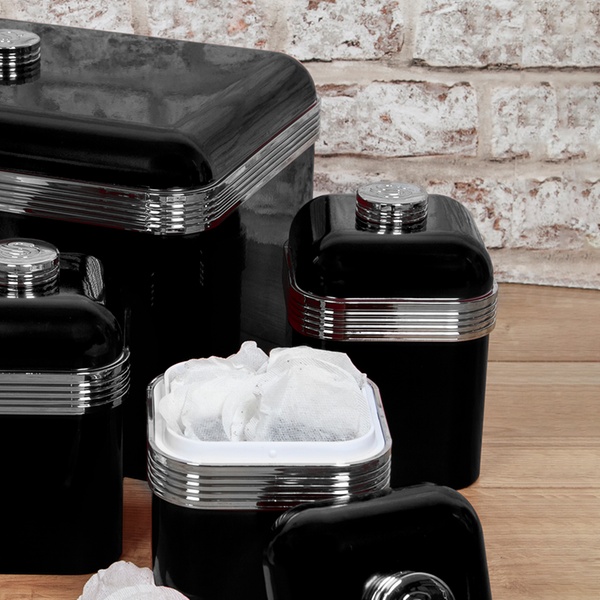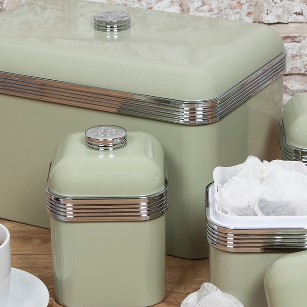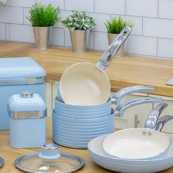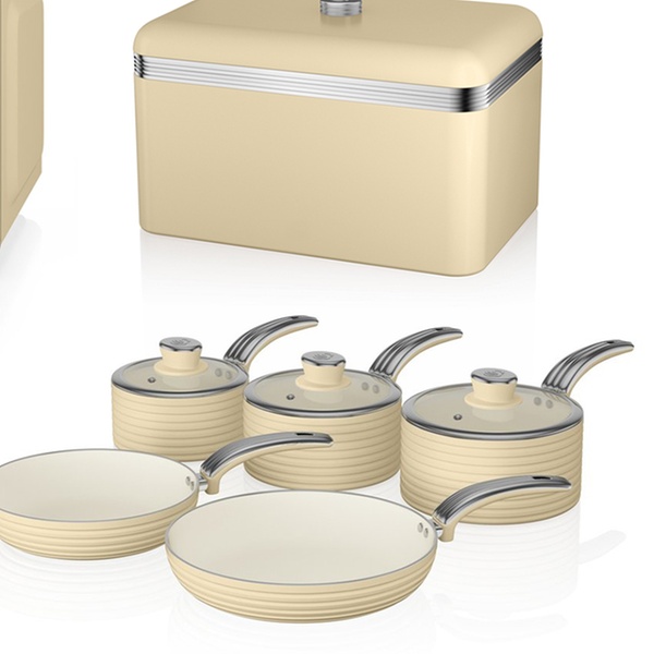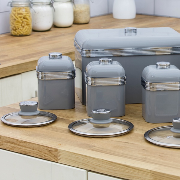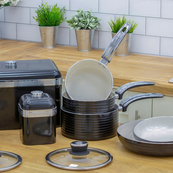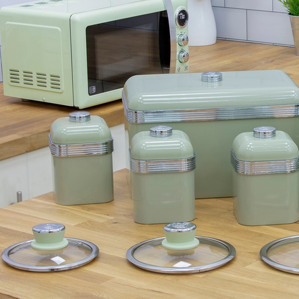 Comprising of a bread bin, digital microwave, five pans and three canisters, this set combines both practicality and style