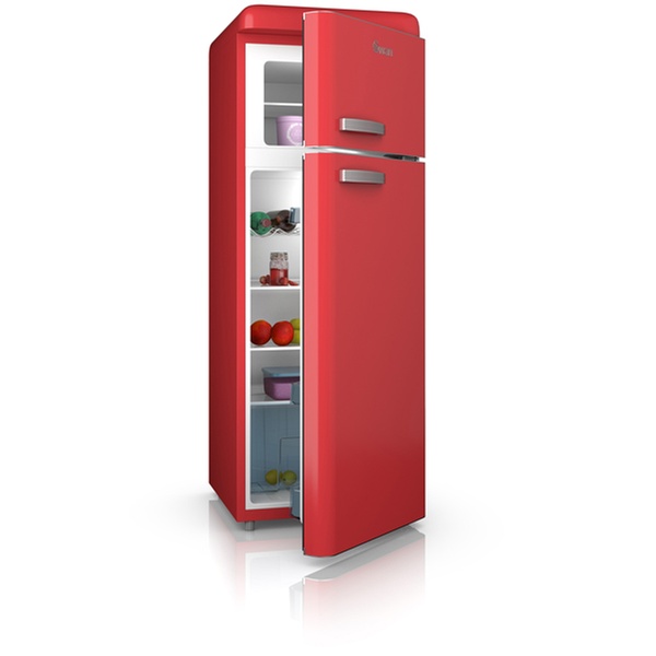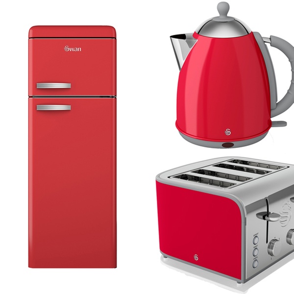 Add retro chic to the kitchen with this set of top-mounted fridge freezer, jug kettle and four-slice toaster available in three colours