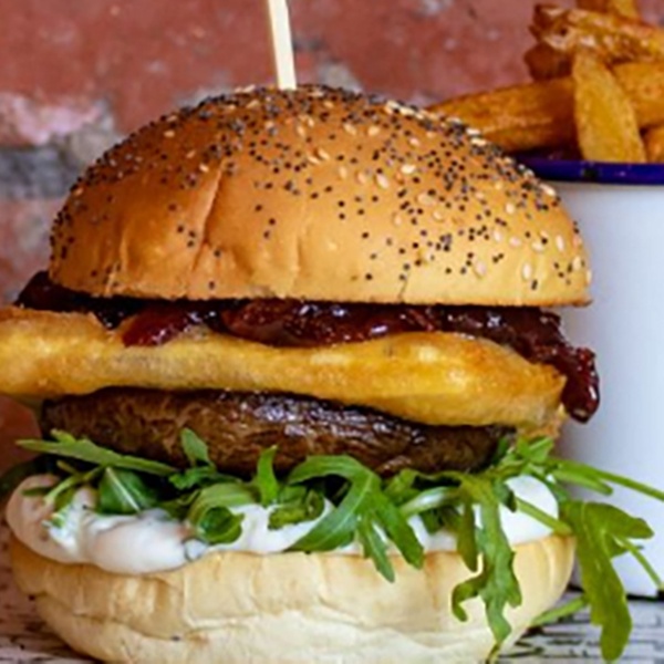 - Mains available include: Mediterranean pizza | flat field mushroom burger with lettuce, tomato and salsa in a vegan brioche bun with skin-on rosemary salted fries | quinoa burger with lettuce, tomato and vegan mayo in a vegan brioche bun with skin-on rosemary salted fries | halloumi and courgette kebab with rosemary salted fries