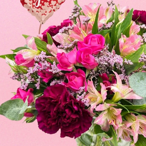Featuring vibrant pink roses, fiery red carnations, delicate baby’s breath.