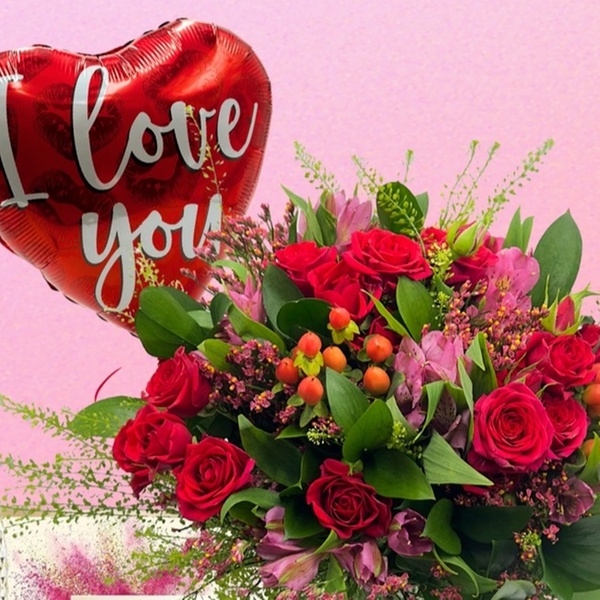 Classic red roses, sweet pink wax flowers, and a touch of fresh greenery.