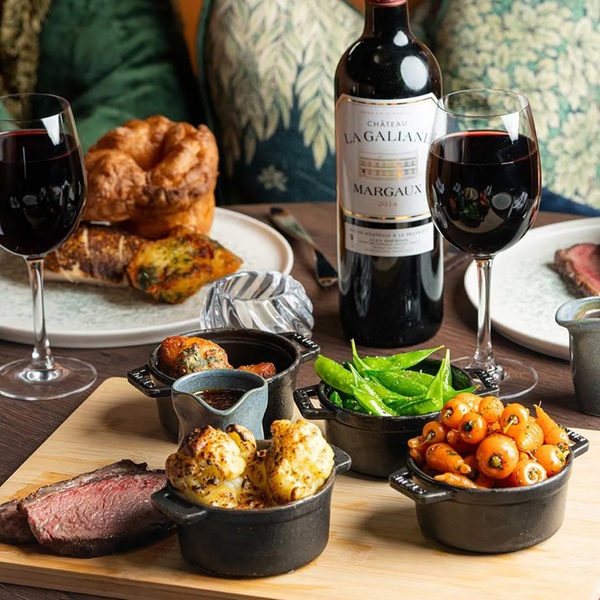 Experience hearty Sunday roasts featuring ethically sourced meats cooked over fire, accompanied by fine wine!