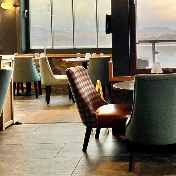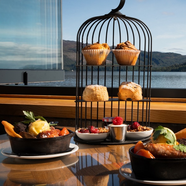 Delicious Dining: Savor homemade scones, sweet treats, and organic teas in a stylish dining lounge with panoramic views of Loch Lomond.