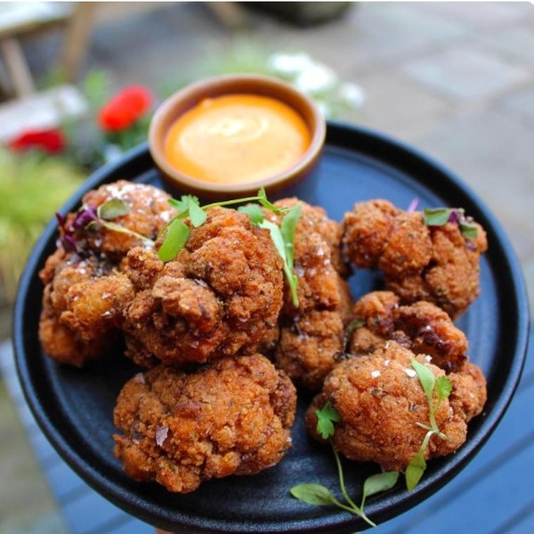 - Cauliflower Wings – A vegan twist on a classic, served with sriracha mayo dip (VE).
