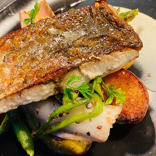 Pan-seared tuna served with a warm medley of olives, tomatoes, chillies, peppers, onions, leek, and potatoes.