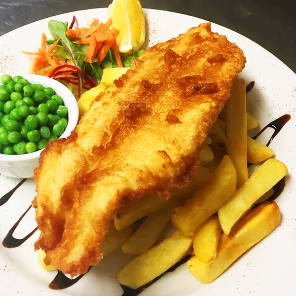 • Classic fish & chips with mushy or garden peas and tartare sauce (g)