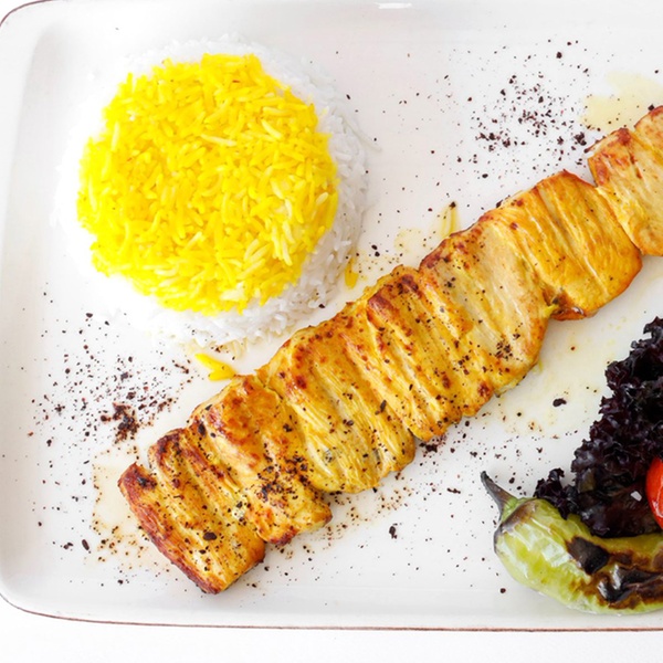 Joojeh – Skewered boneless chicken marinated in yoghurt and coarse pepper, served with saffron rice & tomato