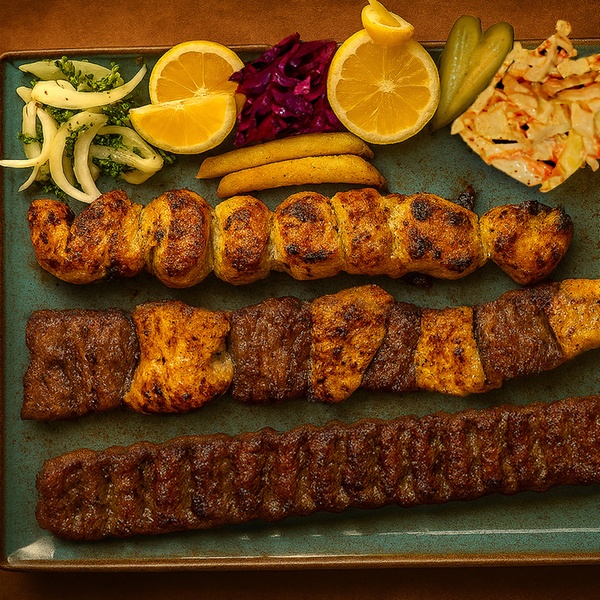 Kobideh– Two skewers of grilled tender minced lamb with onion & mild spices, served with saffron rice