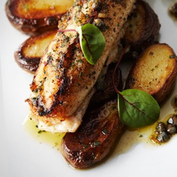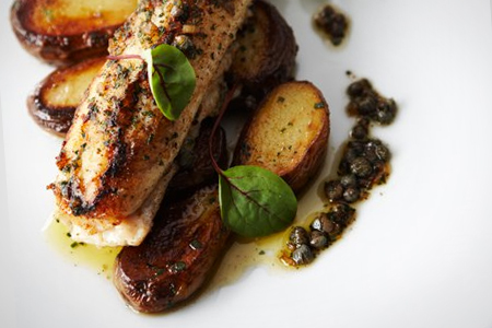 Lemon poached cod with sauteed new potatoes, seasonal vegetables, baby carrot and lemon, caper butter