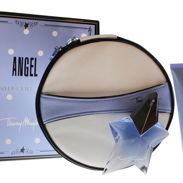 - Includes a Thierry Mugler Angel Eau de Parfum, body lotion and a vanity case