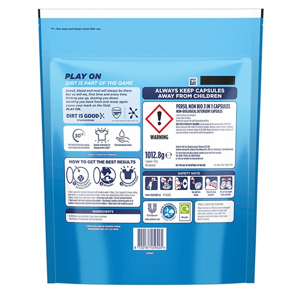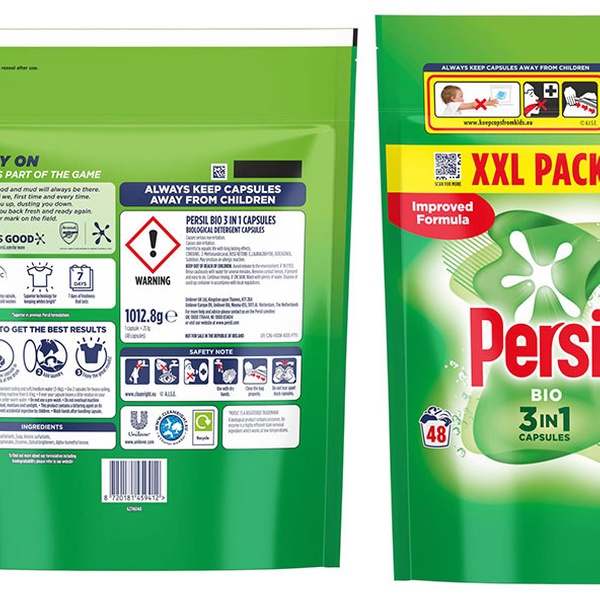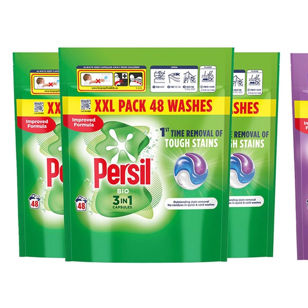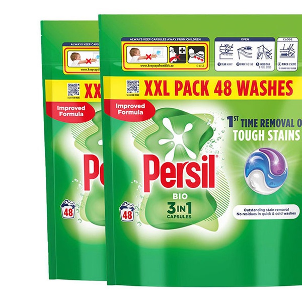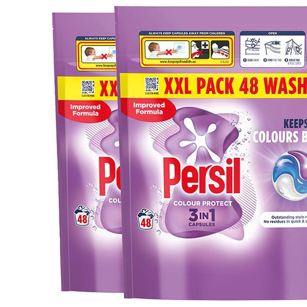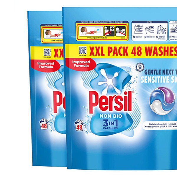 Persil XXL 3-in-1 Washing Capsules combine Bio, Colour Protect, and Non-Bio formulas to remove stains, keep colours bright, and stay gentle on sensitive skin, providing 48 washes of fresh, clean laundry