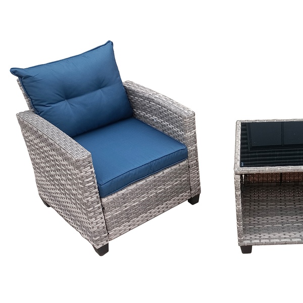 - Three-piece set includes two single armchairs with cushions and one glass top coffee table