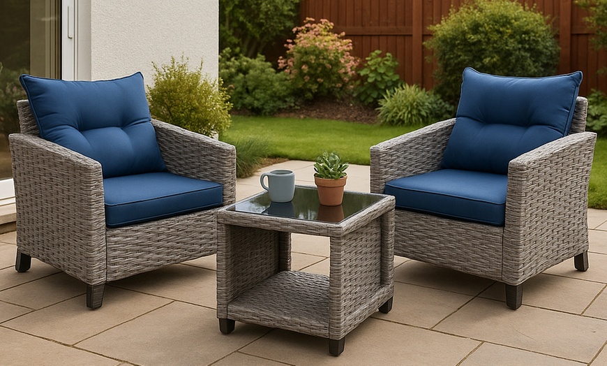 Today's Groupon offers Three-Pieces Rattan-Effect Bistro Set with Glass Top Coffee Table, distributed by Furniture One Limited.