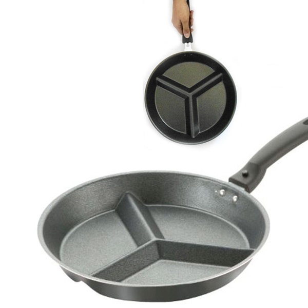 Made with high-quality metal, this three-section frying pan features a detachable handle and non-stick coating
