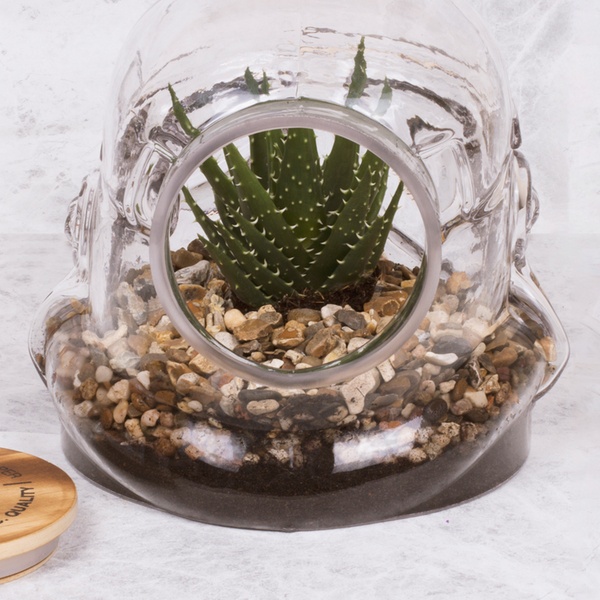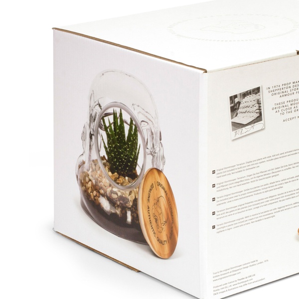 - Empty glass original Stormtrooper helmet terrarium and wooden lid
