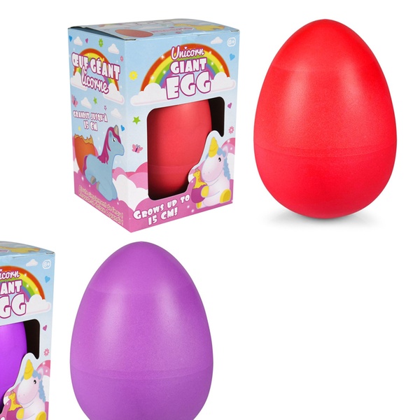 Available in three different colours, this giant egg hatches to reveal a growing Unicorn