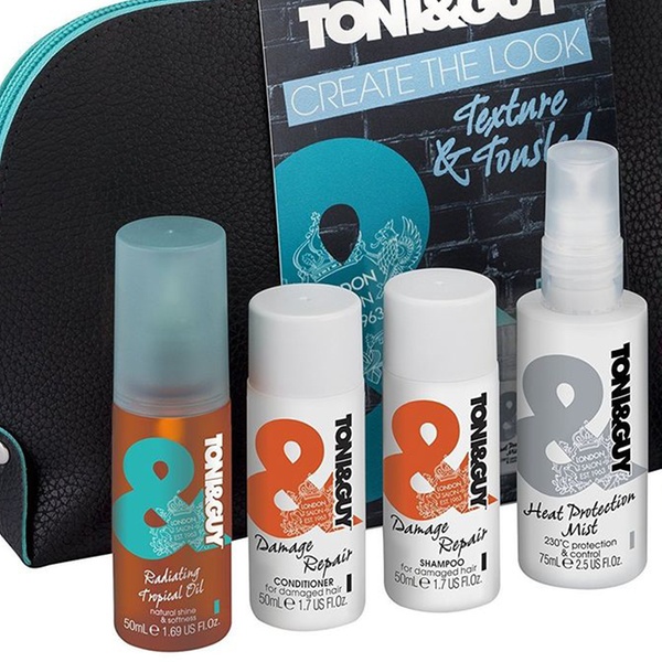 Packaged in a stylish Toni and Guy wash bag, this set contains a range of hair care and styling products