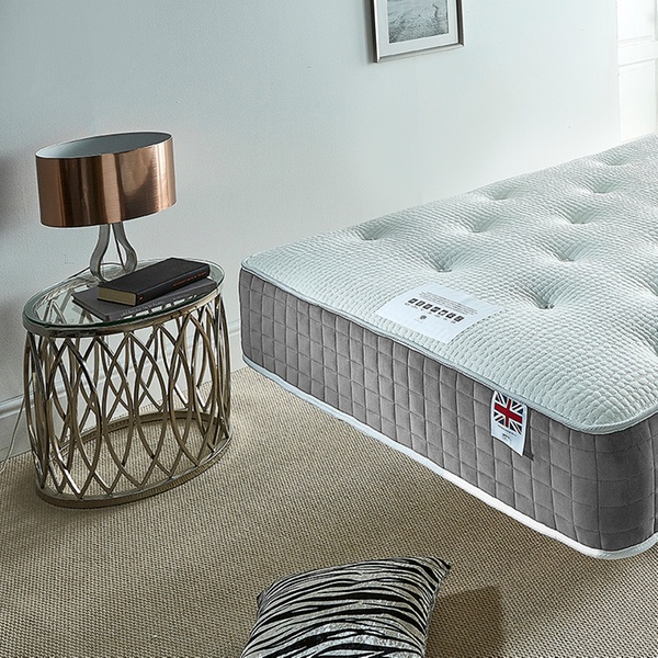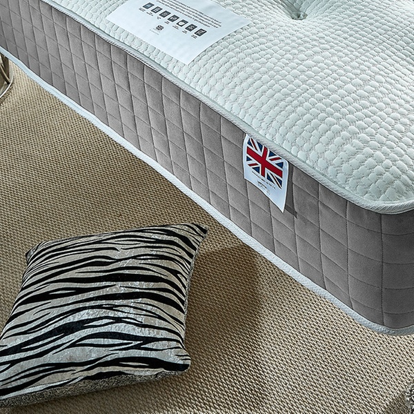 This mattress features a spring system topped with a layer of memory foam finished in a soft sophisticated grey border and tufted knit top
