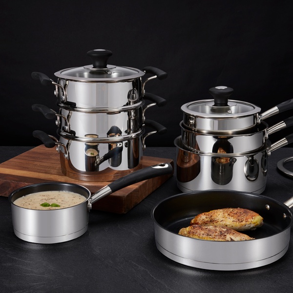 - Mirror finished bodies feature an encapsulated steel base to provide even heat distribution for more efficient cooking results