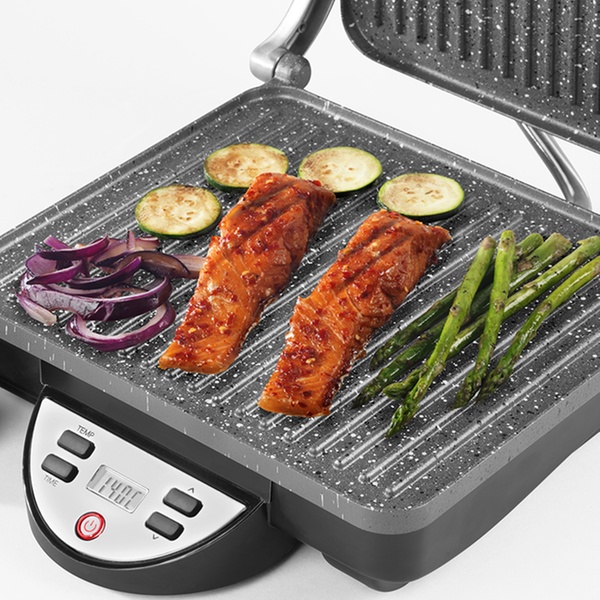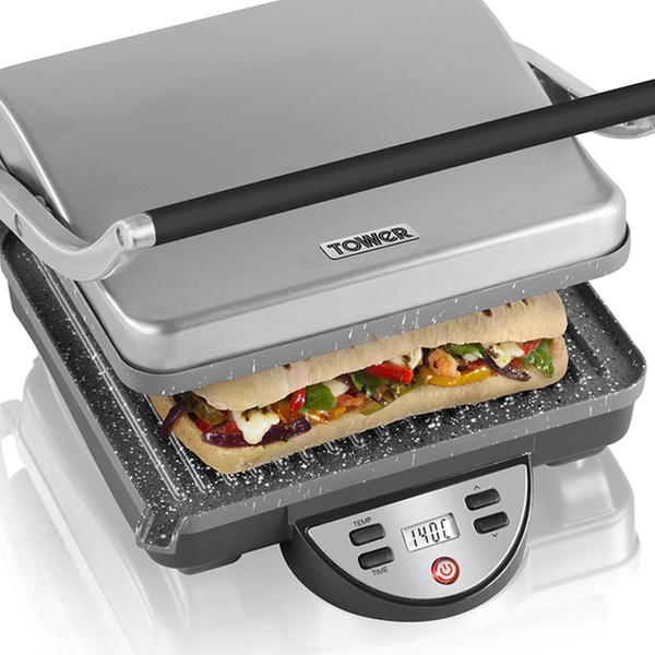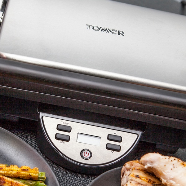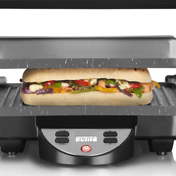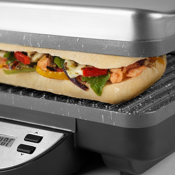 - Thermostatically controlled double-sided cooking plates for fast and even grilling