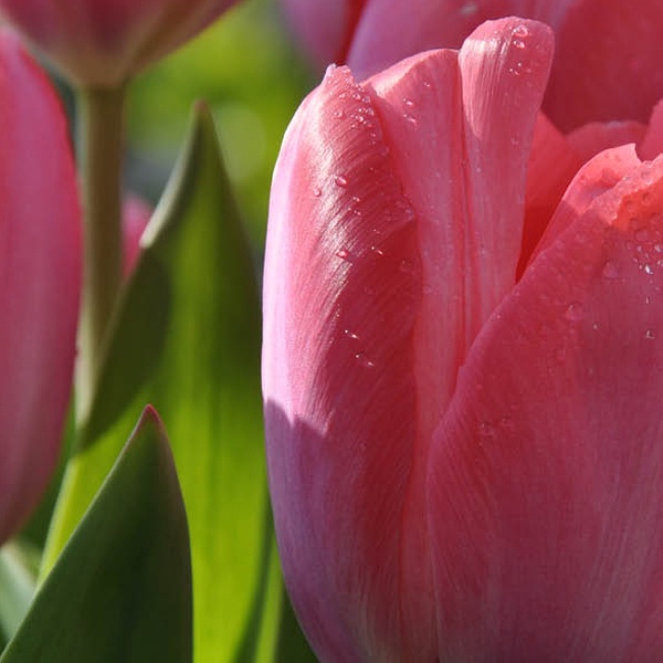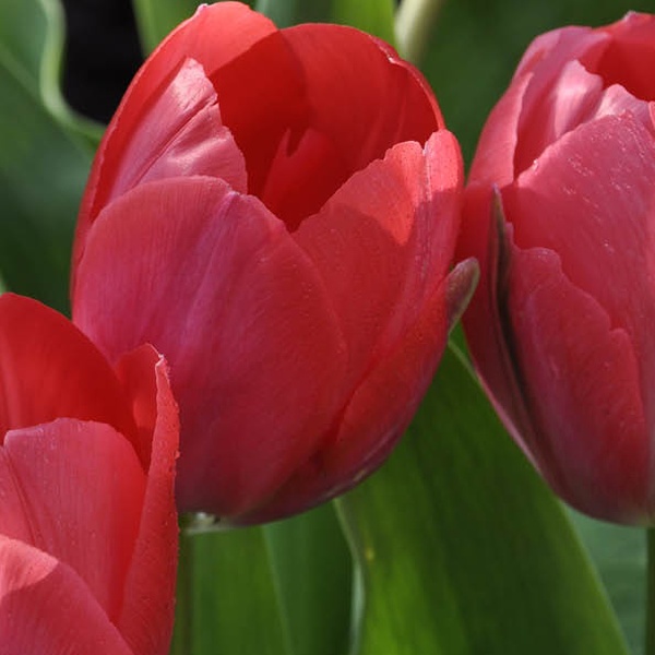 Reddish-pink blooms with a subtle sheen, these tulips bring vibrant early spring colour to gardens, growing up to 50cm tall