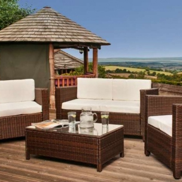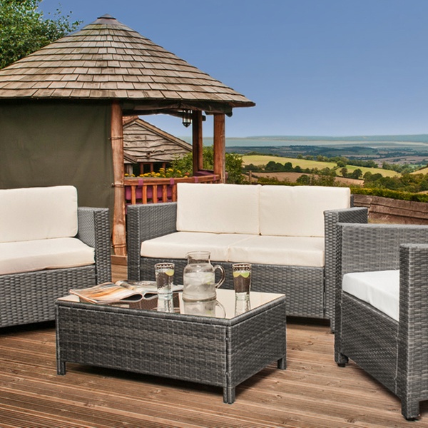 Have a nice garden party or spend a leisurely Sunday outside with this comfy furniture set including a sofa, coffee table, and two armchairs